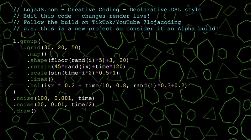 So LojaJS was born - live coding website where you can create chainable, functional DSL for generating animated procedural graphics in the browser.